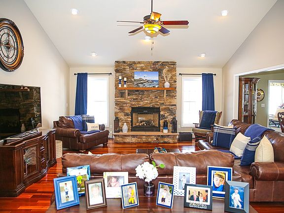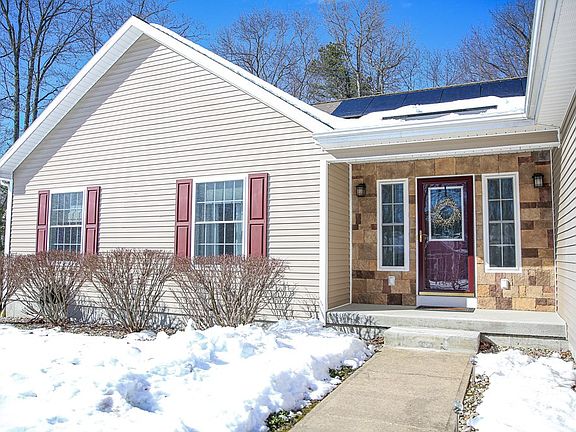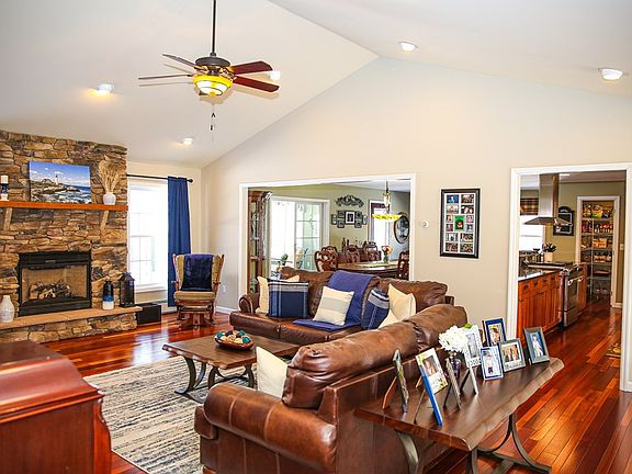 Don't miss your chance to see this exclusive custom designed, meticulously maintained ranch style home! The generously sized foyer w/ ceramic tile flooring welcomes you & opens into an elegant & spacious living room. Soaring ceilings, a fieldstone natural gas fireplace & gorgeous Brazilian cherry floors are just a few of the features this magnificent space offers. The open floor plan allows you to view the gourmet kitchen, perfect for any home chef, w/ high-end stainless steel appliances, granite countertops & soft closing luxury cherry cabinets. An oversized pantry offers tons of storage & additional refrigeration. The large formal dining room is ideal for hosting gatherings. There is plenty of space to entertain in the fully finished basement with a custom 16 ft bar, modern fireplace, & full bathroom. Solar panels (owned) keep utility costs low averaging $200 per month for both heat & electric. With backup power from the whole house automatic generator you'll always be warm & cozy!