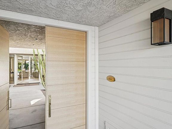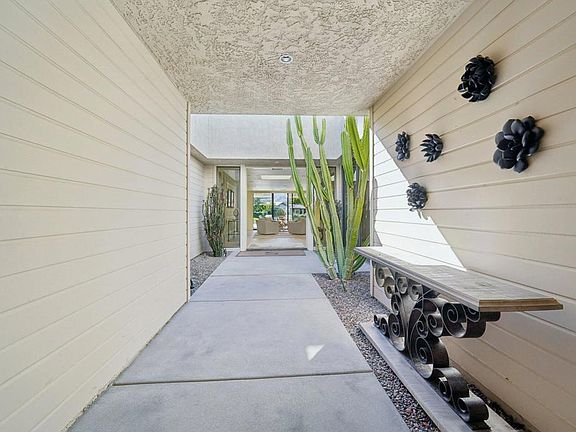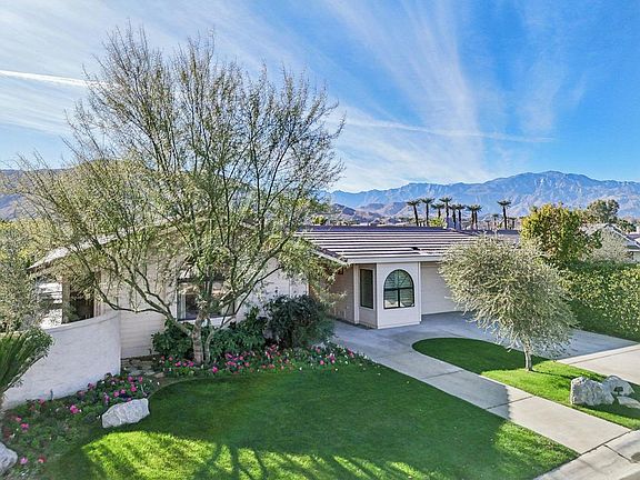 Located in the exclusive, gated golf community of Morningside, this exquisite home was once the residence of Barbara Sinatra and has since been thoughtfully remodeled to blend luxury with modern comfort. Spanning just under 3,600 sqft, this 3-bedroom, 3-bathroom home offers an unparalleled desert living experience. The highlight of the property is the beautifully renovated pebble tec pool, now featuring a sleek rectangular design with a sunshelf, spa, and panoramic views overlooking a serene lagoon, the golf course, and the stunning western mountains -- the perfect backdrop for desert sunsets. The primary suite boasts a fully updated ensuite with an oversized walk-in shower, dual shower heads, and custom finishes. The living room showcases the iconic Morningside vaulted beamed ceiling, enhancing the sense of space while capturing those majestic views. Elegant wainscotting details in the main living areas and foyer, paired with updated lighting, add sophistication to every corner. A wet bar in the living room, complete with an ice maker, is perfect for entertaining. One of the bedrooms is treated like an attached casita, with outdoor access from the private inner courtyard. This offers an ideal setup for live-in help or guests who can come and go freely, adding flexibility and privacy. This remarkable home offers an exceptional opportunity to live in one of the most sought-after communities, combining history, elegance, and modern amenities in one spectacular package.