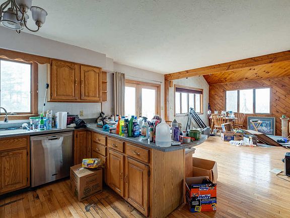 Tons of potential in this adorable home that sits on top of a hill overlooking Sabattus Pond. Enjoy the beautiful view through the trees while sipping coffee on this wrap around deck, or from the windows in the first floor primary bedroom. Light pours in through the windows and skylights in the vaulted living room, and the wood and stone details bring tons of character to this home. Two additional bedrooms upstairs and a walkout basement is available for additional living space. Make this home yours with a little imagination and TLC.