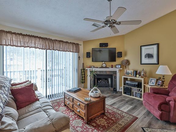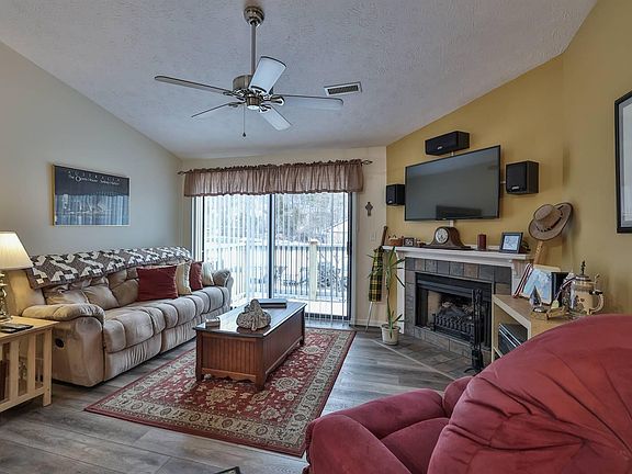 Move in ready condo in convenient location within minutes to interstate & downtown! Soaring cathedral ceilings, luxury vinyl plank flooring, & popular split bedroom floorplan. Fully equipped updated kitchen w/ counter bar, pantry, plus plus adjacent dining area. Large living area features tiled surround wood burning fireplace w/ electric insert, & a walkout to the deck. Master suite boasts adjoining tiled bath, walk in closet, & cathedral ceiling w/ fan. 2nd bedroom, 2nd full bath, & laundry facilities. Extra storage closet in building. This unit is right across from the community pool! Tennis court & basketball court in community. Shows well & 1 year Cinch Warranty is included!