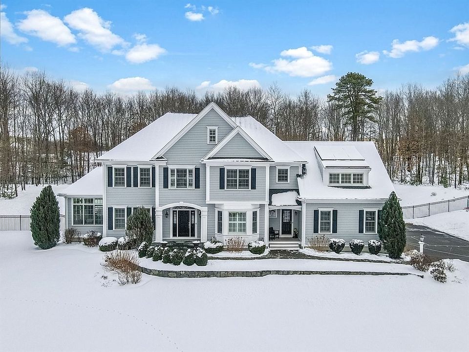 Welcome to 10 Wrights Farm Rd., a stately colonial home located in the desirable Preserve at Keeney Pond in Norfolk, MA. Built in 2016, this 5140 sq.ft. residence sits on a private, fenced in 1.1 acre lot. Offering 5 bedrooms with 2 primary suites, 5.5 baths, and a finished basement with full bar, media & exercise room. The interior boasts hardwood floors, accent ceilings, a cozy gas fireplace, private office, and a chef's kitchen with high end appliances. The backyard features a luxurious in-ground heated pool, spacious patio complete with elegant stonework and fire pit area, as well as a built-in spa to enhance the resort-like feel. A true retreat. Highly efficient, solar owned energy keeps costs low. Attached three-car garage and a whole house generator. Nestled in a peaceful suburban setting with easy access to Boston and just a 5 min walk to the commuter rail and 10 min drive to Gillette Stadium. This home is the perfect blend of luxury and convenience.