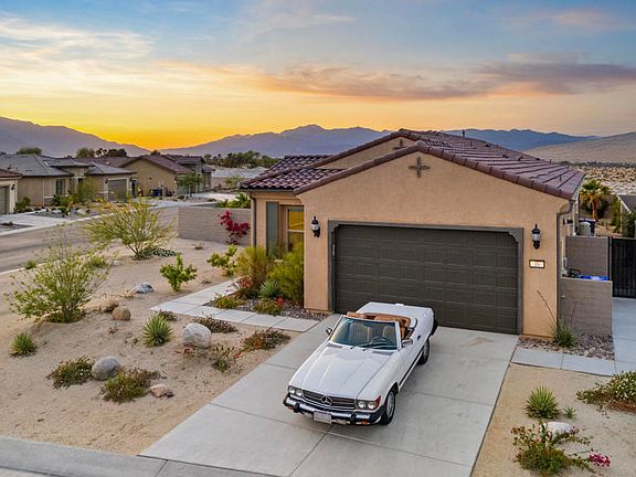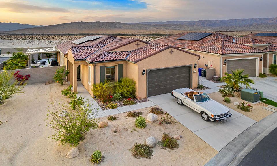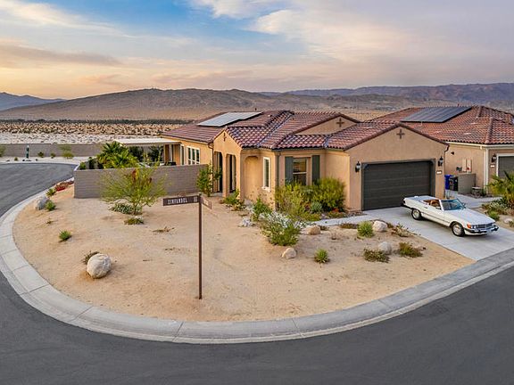 Welcome to 10 Zinfandel in the prestigious Del Webb, Rancho Mirage 55+ community. This stunning, Expedition Model, single-family home boasting 1,770 square feet of well-designed living space offers a harmonious blend of comfort and style. As you step inside, you'll be greeted by high ceilings and gleaming hardwood floors that flow seamlessly throughout the home. The spacious living area is anchored by the working fireplace, creating a cozy ambiance for relaxation.The chef's kitchen is a culinary dream, featuring a breakfast bar, gas stove, an island with premium quartz counters, range hood, refrigerator, wall oven and built-in microwave. This open kitchen is designed for both everyday cooking and entertaining.The home offers three generous bedrooms, including a primary suite with an ensuite bathroom. The primary bathroom features separate vanities and a windowed design, providing a bright and airy feel.Step outside to your upgraded pool and spa, with a custom pergola perfect for outdoor dining and relaxation. The private backyard with stunning desert views includes a barbecue area, ideal for gatherings. Parking is a breeze with an attached garage, guest parking, and street parking available.Residents of this community enjoy access to exceptional amenities, including a clubhouse, common media/recreation room (for yoga classes and community events etc), two large communal pools, a jacuzzi, pickle ball and tennis courts, 18-hole putting green, golf simulator and a state-of-the-art gym. With central AC, central heating, and 13 owned solar panels this home ensures year-round comfort. Experience the best of indoor and outdoor living at Del Webb, Rancho Mirage. Don't miss this opportunity to make it yours!