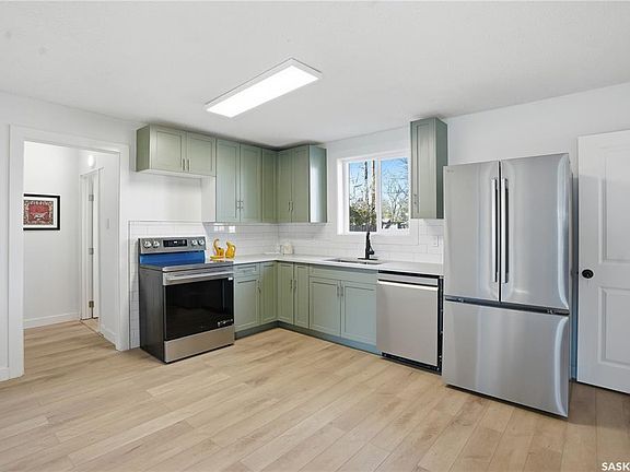 Newly renovated 914 sq ft bungalow in Caswell Hill! Featuring brand-new kitchen cabinets, appliances, flooring, windows, furnace, and hot water tank. The main floor offers two bedrooms, a full modern bathroom, and a spacious living and dining area. The basement has a separate entrance and includes two self-contained units: Unit A with one bedroom, a living room, a kitchen, and a 3-piece bathroom; and Unit B with a living space, a full bathroom, and a counter with sink — perfect as a studio or guest suite. Located directly across the street from Saskatchewan Polytechnic, this property is ideal for families with students or for generating rental income to help with your mortgage! Double detached garage is insulated and boarded ,its ready for the coming winter. Seprate electrical panel in the garage.