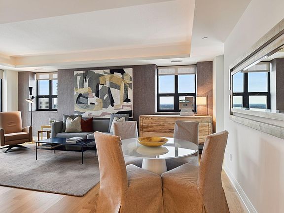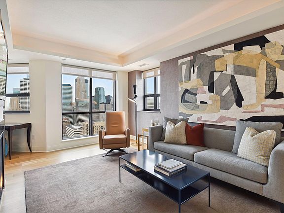 Welcome to the 29th floor of The Carlyle! This meticulously cared for 2 bedroom 2 bathroom home has stunning views of downtown Minneapolis. Every detail has been carefully considered, from the dimmable lighting throughout to the new wood floors. The kitchen has gorgeous tile backsplash, smart under counter lighting, and new appliances and easily flows to the elegant living room and dining room. The living room is centered around the cozy gas fireplace, while the adjacent balcony offers stunning views of the Mississippi River. Owner's suite features new carpeting in bedroom, walk in closet, serene bathroom with dual vanity and separate tub and glass shower. The office is fitted with stunning built in cabinetry and a wine fridge for the connoisseur.