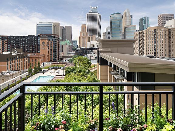 Updated Carlyle residence lives like you are in a 2-story home, looking out over the treetops to your pool deck oasis. From the 7th floor, this condo is awash in daylight by floor-to-ceiling windows, to enjoy views of the Mississippi, Stone Arch Bridge & Downtown. This Dickenson, 2BR + den & 2BA home has been extensively updated with modern touches: new light oak hardwood floors, flat front cabinets, apron front SS Sink; office area with extensive built-ins and ‘skylight’; primary suite with double-vanity, heated towel bar and additional closet space; added airbath tub/shower in hall bath; wall of bookcases/desk in second bedroom; wool carpets; custom lighting; and more. Gas hookup for BBQ grill. Storage on 2nd Floor. Two parking spaces on P6. Carlyle Common Area stunning renovations & 5th Floor Club Room. The Carlyle offers 1GB+ internet, cable, 24-hr front desk attendant, large fitness area, outdoor pool deck w/grill & fire pit, 3 guest suites, and more!