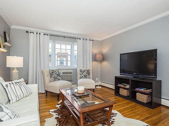 Terrific, two-bedroom unit has a lot to offer! Desirable corner unit in the rear building, away from the street. Bright & airy spacious rooms, hardwood floors, great closet space and painted in neutral grays & white. The kitchen, open to the dining & living area, has been updated with granite, new stainless fridge, and features generous cabinets, ceiling fan and a 5 ft. peninsula/breakfast bar with seating. The living room, with plenty of wall space for furniture & large TV, has 3 front-facing windows and overlooks the exterior greenery. Each of the two bedrooms has a double-wide, 7 ft.closet and both easily fit a king bed & more! Easy one-floor living with laundry and a separate storage unit just a few steps down the stairs, and your exclusive parking space is close to the entrance. Solid professionally managed complex, convenient to shopping & highways. Condo fee includes heat & hot water. Pets OK with some restrictions. Won't last long!