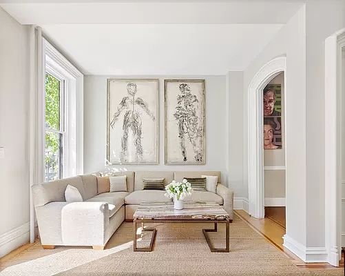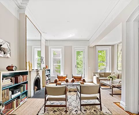 Spanning 3,900 square feet and four stories, 100 Sixth Ave is a stately two-family brownstone nestled on a bucolic North Slope block. Measuring 20-feet wide with ceiling heights up to 11'8", the house is currently configured as an owner's triplex over a garden one-bedroom. Painstakingly renovated over time, 100 Sixth Ave features stunning period details and impressive examples of historic restoration. Blending rich materials and finishes while never once disrupting its old world feel, 100 Sixth Ave is a majestic Park Slope brownstone designed by Zoe Brill interiors, ideal for those seeking a bespoke Brooklyn home. Up the stoop is the gracious entrance to this grand home. Original details mixed with a contemporary design sensibility can be seen everywhere. Restored doors & plasterwork, Michelle Weinberg cement tiles, arched doorways & striking moldings set the tone for the jaw dropping foyer. A grand salon awaits in the rear of the parlor which spans the full width of the house. The living room features a wood burning fireplace, pier mirror, perfectly intact crown moldings, new windows and ample wall space for large scale artwork. The renovated kitchen features poured concrete countertops, Thermador appliances, custom walnut millwork and brushed limestone floors. Through a dramatic archway with a pocket door is arguably the most beautiful space in the house: the formal dining room. Clad in hand lacquered navy walls, this dramatic room features a wood burning fireplace with marble mantle and pier mirror and gorgeous restored parquet floors. There is also a newly built patio and staircase off the parlor level featuring custom railings and bluestone tile. Down the staircase is the private garden which is lush and uniquely abuts the rear extension of an adjacent brownstone, creating an 80-foot-tall brick backdrop covered in ivy; quite literally a living art wall adding privacy & greenery to every rear exposure from 100 Sixth Ave. Up one flight is the primary suite with adjacent dressing room and a full windowed bathroom. The bedroom features three large windows overlooking Sixth Avenue treetops, 10'6" ceilings, restored floors and a dreamy dressing room making this level both practical & enchanting. The primary bath was just gut renovated and features a walk in shower with Clé Tiles and marble trim, custom double vanity with RH fixtures, Martinique wallpaper and a restored stained-glass window. The top floor features three bedrooms, a utility closet, a skylight and another renovated bathroom. The largest bedroom can serve as a guest room and features a fireplace with marble mantle, Eskayel Wallpaper, two closets and east facing windows. The second bedroom is currently configured as a study and features a fireplace, custom Uhuru desk and a walk in closet. The third bedroom is the perfect nursery, office or storage room. The second full bath features a custom RH vanity with two sinks, a deep soaking tub with marble surround, Clé Tiles and a linen closet. The garden level is currently configured as a one-bedroom apartment. The space features a large entry with a home office nook, open living and dining areas, original moldings, a charming kitchen with butcher block counters & updated appliances; and a west facing bedroom with a renovated bathroom, exposed brick, separate laundry room and access to the garden. This unit can easily be made contiguous to the upper triplex or it can be preserved as an income producing rental. Additional features of the property include newly updated plumbing, mechanical & electric, laundry located in the garden and basement levels and custom cut rugs & jute runners throughout. Please note all light fixtures are excluded from the sale. 100 6th Avenue is located in the most convenient spot imaginable. Enjoy the best of both worlds with quick access to Manhattan transit and the heart of Park Slope right in your backyard.
