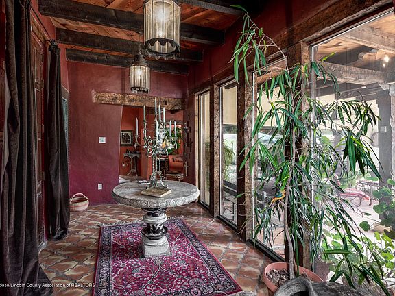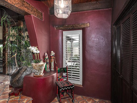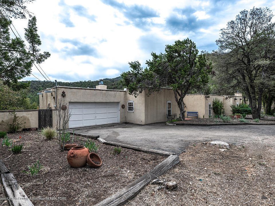 Awesome Adobe, one level home w/Santa Fe & mountain character! 3 bedrooms, 3 baths, living room w/ fireplace, corner fireplace in dining area, den w/fireplace off master (all 3 fireplaces have gas logs), 3rd bdrm could be great art studio, kids play area, etc & could have 2 queen beds. Wonderful character w/tile & beams, shutters, guest suite private from master suite. This could be an artist's retreat for sure! Awesome enclosed huge courtyard/large patio off living, master & other rooms, with wonderful landscaping Additional fenced garden area beyond enclosed back patio area. .97 acre per County, lovely corner lot. double garage & furniture negotiable. Irrigation system, on Mountain Alarm. New roof in last year. Very unique, one of a kind home w/loads of character!