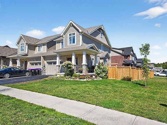 Welcome to this stunning semi-detached home, perfectly situated on a fully fenced, landscaped corner lot in the highly desirable Summit View subdivision. Just 10 minutes from Blue Mountain and a scenic bike ride along the trails into downtown Collingwood, this location offers the best of outdoor living with the convenience of nearby amenities.This family-friendly neighbourhood features a brand-new childrens playground and is close to excellent local schools.The home itself is attached only by the garage, offering the feel of a detached property. The bright, open-concept main floor includes a spacious living and dining area, a modern kitchen with island, and direct walk-out to the deck and private yard. A convenient powder room and inside entry to the 1.5-car garage with a bonus man door to the backyard complete this level. Upstairs, you'll find 3 generous bedrooms, including a primary retreat with walk-in closet and 3-piece ensuite. Two additional bedrooms share a 4-piece bathroom, and a large laundry closet adds everyday convenience.The fully finished basement offers incredible extra living space with a family room, den/office area, 3-piece bathroom, and a laundry sink station.This home combines style, function, and location perfect for families, weekenders, or those seeking a four-season lifestyle in Collingwood.