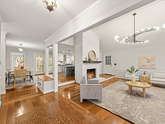 - Chandelier, Crown Molding, Double Vanity, Eat-in Kitchen, Entrance Foyer, Granite Counters, High Ceilings, Kitchen Island, Kitchen/Dining Room Combination, Open Floorplan, Recessed Lighting, Separate Shower, Smart Thermostat, Smooth Ceilings, Walk-In Closet(s)