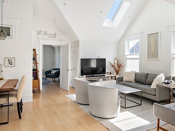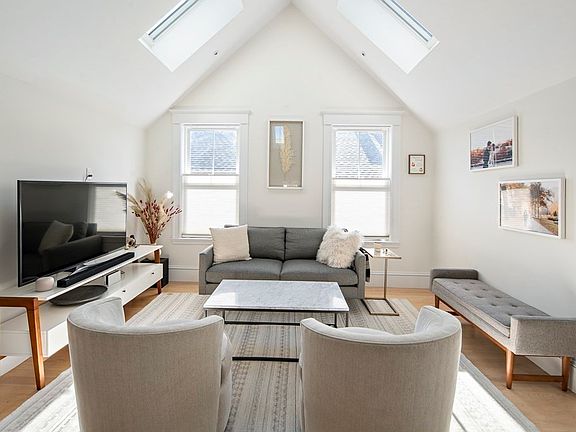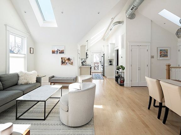 Impeccable penthouse condominium with soaring vaulted ceilings and astonishing all-day light. Gut renovated in 2019, this lovely two bedroom, one bath home has 12’ ceilings with multiple skylights and gorgeous hardwood floors throughout. A chef’s kitchen features stainless steel Frigidaire Professional appliances including a gas stove, shaker style cabinetry, and quartz countertops with a breakfast bar. Gracious open concept living/dining area is ideal for both entertaining and relaxing at home. Private rear porch has a west-facing view for dramatic sunsets. Large, serene bedrooms, each with a generous amount of closet space. Modern full bath with shower, in-unit laundry, and bonus storage in the eaves. One assigned parking space and additional storage. Shared electric car charging station. Near to Magoun Square Green Line MBTA stop, providing easy access to Boston and quick transit to the best new offerings around Lechmere. Close to beloved local restaurants/shops and local highways.