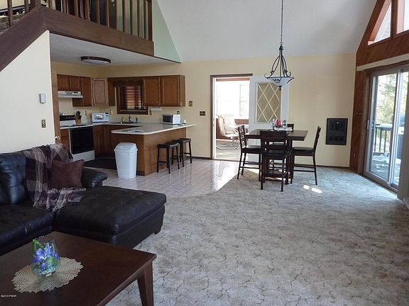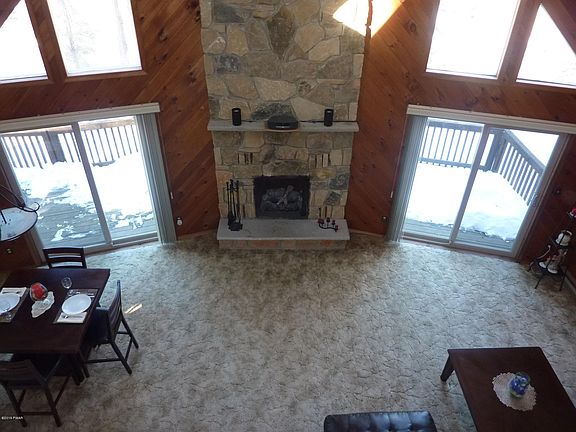 Tanglwood Lakes Classic Chalet. Need a boat slip for the 2019 boating season? How about an immaculate, move-in condition Chalet. Here it is. Classic prow front chalet with custom center floor to ceiling stone fireplace, cathedral ceiling, 3 BRs, 2 full BAs, modern fully applianced kitchen, Family Room with wood t&g walls, woodburner, 3 Season Room, Fujitsu heat/AC unit, roughed in plumbing for 3rd bathroom in Lower Level, heated 1 car garage, paved driveway, large front deck, furnishings negotiable, Lake Wallenpaupack Lake Rights. A Must See Home.