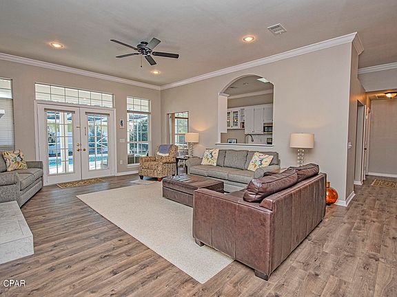 Beautifully updated beach home in the desirable Summer Breeze subdivision, just a short stroll to the beach. This peaceful, golf-cart friendly community does not permit short-term rentals, offering a quiet and neighborly atmosphere. Residents enjoy a variety of HOA social events, making Summer Breeze a fun and welcoming place to call home. The home features an enclosed, heated pool for year-round enjoyment. Conveniently located to the beach, shopping, entertainment, restaurants, Pier Park and much more. The living room overlooks the pool area and is accented with a stylish gas-log fireplace. The Primary Bedroom is very spacious and features an ensuite with a jetted garden tub, separate shower, walk in closet and overlooks the pool area. There is a large dining area for family gatherings as well as a smaller dining area adjoining the kitchen overlooking the pool for cozy meals. The kitchen is fully equipped with nice appliances, gorgeous tile countertops, white cabinets, skylight, and breakfast counter bar. This home is ideal for family fun and entertaining. The sprinkler system has a timer and its own well. Laundry room includes washer & dryer plus pull-down ironing board. The home is furnished including pots and pans. The two antique tables do not covey and some personal items of seller will not convey. The contents of garage including car and golf cart do not convey but may be purchased separately. All measurements are approximate. If important, please self-measure.
