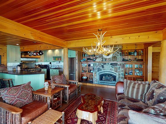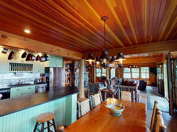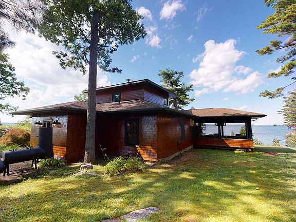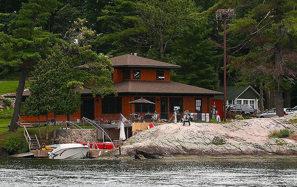 Thousand Islands Seaway retreat. ~250' waterfrontage. 2440 square foot, 3 bedroom 2 full bath waterfront home with two bedroom one full bath 672 sq ft Guest house. Welcome to Key Largo North, a St. Lawrence Seaway paradise. This river front property is one of 13 private homes nestled in a covenant community called Blind Bay. This unique property setting has a direct westerly view of gorgeous sunsets that face Canada. The ships are larger than life as they pass by within 400 yards of this over 1 acre property, with shorelines that span over 250 feet with 190' of custom permanent steel pile docks. An integrated boathouse with a double slip was blasted into the rock face and is covered with a yard level concrete terrace with wrought iron railings. WOW this boathouse will not impede your view of the tranquil St. Lawrence Seaway. This beautiful property is loaded with unique items. From a Russian ships binocular mounted to the granite outcropping, to a 30' steel ship sculpture with a living Osprey tower and pink lime stone, dry stacked landscape walls that lead into the dialed in residence called Key Largo North. Once inside you will walk across acid etched cola in color concrete floors. These floors are insulted and have radiant heat tubing throughout. The house has been heated every winter at a cost of no more than $800.00 All interior cabinets were handcrafted by local Amish craftsman. The wood work throughout every room was crafted by the best trim carpenters in the North Country. There are 3 bedrooms that comfortably sleep 10. There are 2 bathrooms. The main bedroom is a crow's nest on the 2nd floor with a private bathroom and 300 degree views. Kitchen has custom green anaconda soap stone counter tops with a 48" double oven Viking stove. Overhead is a hammered copper and wrought iron exhaust fan hood. Conveniently located on the south side of the home is a screen porch that offers shade throughout the day. A peaceful place to read, nap or visit with friends and family. Custom fabricated chandeliers are throughout the home. Priceless Indian artifacts are available to interested buyers. For example an ancient Alligator Cyprus coffee table with 1200 year old Indian artifacts, as well as a coat rack made of the same. A mule deer chandelier and a 1940 vintage Musky lure mirror with the fish bite marks! All interior furnishings can be available. This property also has a guest house otherwise known as the Fish Shack. This 672 square foot guest house is located on the southwest corner of the 1 acre property and has 2 full size bedrooms, a bathroom and kitchen that includes a Wolf electric cooktop. This guest house was built in the 1940's. The interior has been remodeled with wood paneling, trim and built ins. Celling is white washed bead board. The exterior has the original asphalt siding. A charming guest cottage for over flow of guest with 270 degree water views. Along the private gravel driveway is walk-in storage shed. This home is owned by a Marine Contractor. Every detail has been addressed to give you maximum waterfront home views and easy water access. An overall user friendly property. This home is pure enjoyment. A MUST SEE!