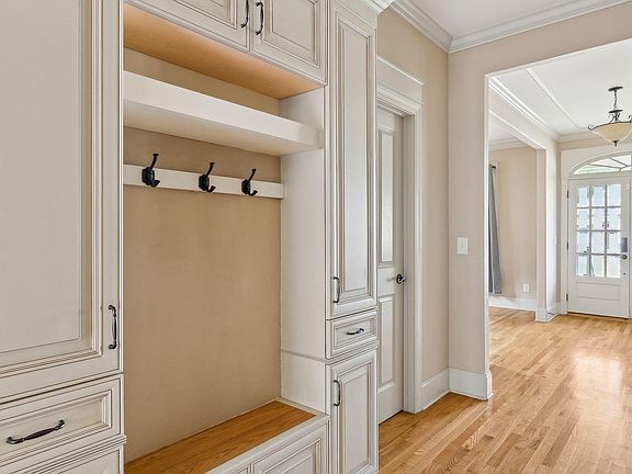 As you step through the charming covered front porch into a bright foyer, warmth and sophistication welcome you. The living room, bathed in natural light and adorned with high ceilings and elegant crown molding, features a cozy natural gas fireplace, creating an ideal space for relaxation or entertaining. The open floor plan seamlessly connects the living area to the renovated kitchen, which boasts custom cabinets designed for space optimization. The expansive island and natural gas stove provide ample workspace for families and culinary enthusiasts alike.
