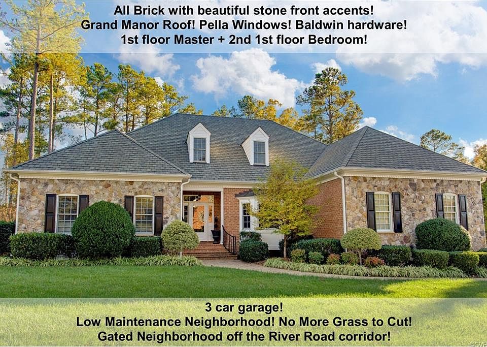 Exceptional quality and detail throughout this charming all brick home with stone accents! Large, spacious formal rooms for gracious entertaining. Banquet sized dining room. 1st floor master with bay window for sitting area and with large master bath featuring a generous sized easy to enter shower and relaxing jetted tub. Huge master closet. Large kitchen with granite and s/s appliances is open to a fabulous family room with vaulted ceiling, gas fp and access to the raised patio. Possible additional 1st floor bedroom w access to full bath. Upstairs are 2 bedrooms - each with ensuite bath and loft den. Expansive easy to walk in attic storage. You can move from your current house without having to toss anything. Easy carefree living with lots of HOA benefits - including grass cutting. trash removal, once a year gutter cleaning and more. Excellent location off River Rd. 10 minutes to Short Pump.