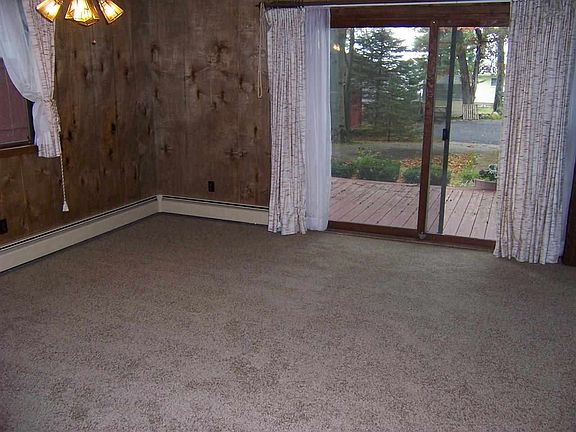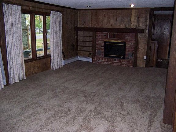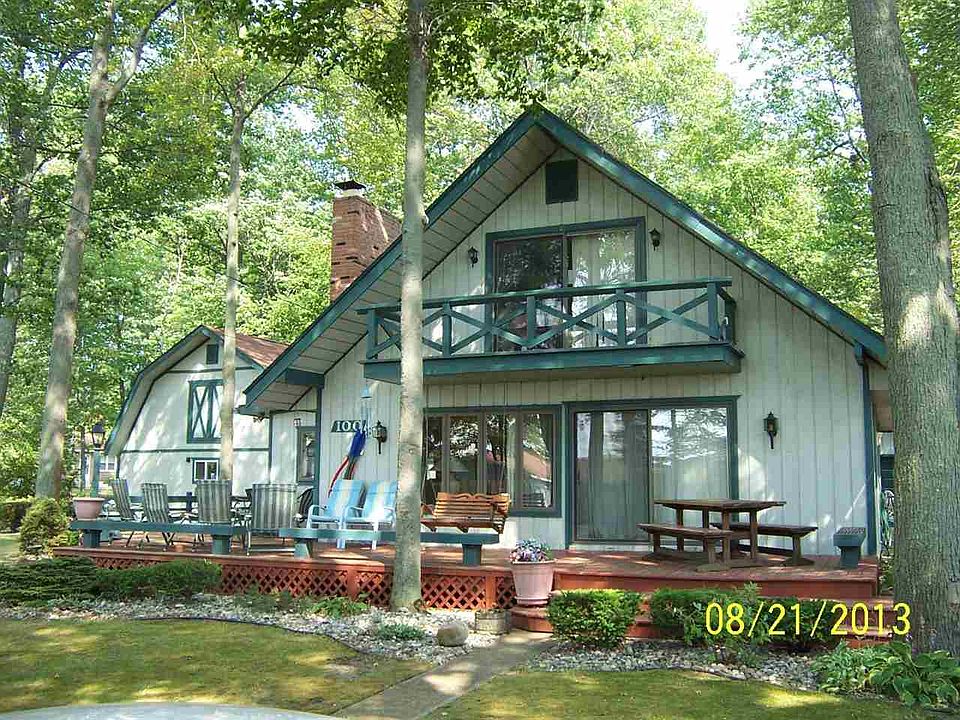 Lake views across street, 3 wooded lots, lake access nearby, two garages, wrap around deck and several patios. 3 bdrms up, 2 down, bath on each level, gas-log fireplace, natural gas heat, open floor plan. Upper bedroom has a lanai with fantastic views of the lake. New carpeting installed Sept. 2014. 3-car garage has power lift for storing heavy items on upper level . Sale includes a 3rd wooded, vacant lot.