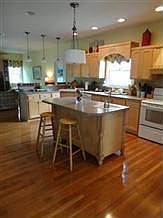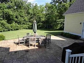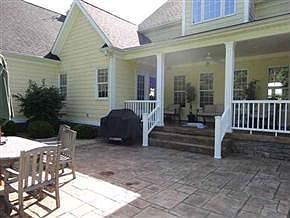 Concrete board siding, see through fireplace between family room and kitchen, hot tub on patio, lot reaches into wooded area behind property.