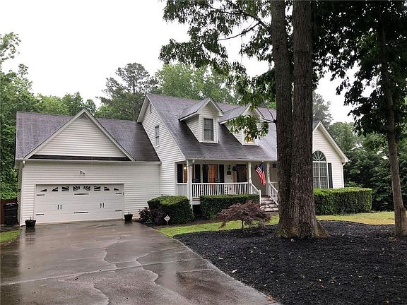 Charming home nestled on gorgeous wooded lot w/ rocking chair front porch! 2 story entrance foyer & hardwood floors greet you. Master on main has vaulted ceilings & private master bath w/ garden tub! Renovated kitchen has granite countertops, SS appliances, & breakfast area. Separate dining room w/ beautiful windows. Spacious living room has cozy fireplace & vaulted ceilings w/ catwalk balcony! Large bedrooms upstairs share full bath. Back deck has stunning view of the fenced, private backyard! FULL unfinished basement has additional garage/boat door w/ tons of storage!