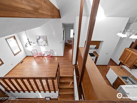 Lots of natural light 2 bed 2 bath condo w/ vaulted ceilings. New interior paint and new carpet. Great location with easy access to JBER, Hospitals, downtown, and the highway. With a wood burning fireplace, open kitchen, multiple decks/patios, & deep garage.