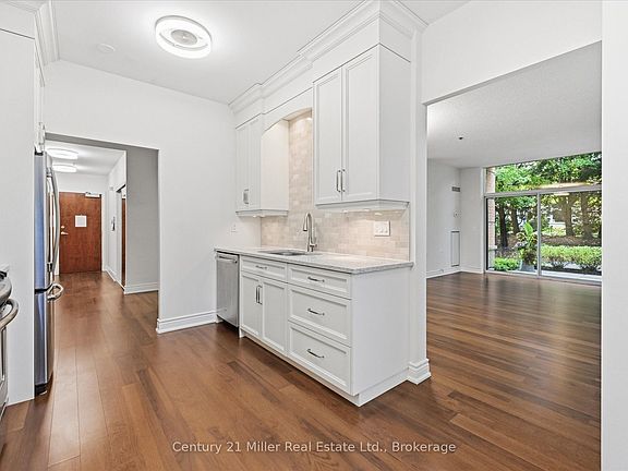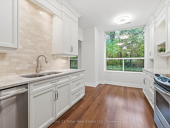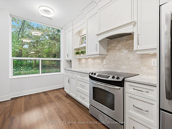 An ultra-rare ground floor corner suite is now available! Welcome to Hearthstone by the Lake, where independence, comfort, & care come together seamlessly in one of Burlington's most sought-after retirement residences. Ideally located just steps from the waterfront, Hearthstone offers a vibrant lifestyle surrounded by beautifully maintained grounds, friendly neighbours, & exceptional amenities. This rare ground floor corner suite features the largest floor plan, with 9' ceilings & approximately 1,485 sq. ft. of bright, open living space. Peacefully tucked away in a quiet area of the community, this unit offers the ideal mix of privacy & connection. Designed with accessibility & ease of living in mind, the home showcases smooth hardwood flooring for effortless mobility. The spacious layout includes 2 bedrooms, an oversized den, & 2 full bathrooms, providing plenty of space to relax. The primary suite features a walk-in closet & a fully accessible ensuite complete with a walk-in tub. The second bedroom offers a cozy, carpeted space perfect for those who prefer a warmer, softer feel underfoot. The bright kitchen includes stainless steel GE appliances, under cabinet lighting, & ample cabinetry, plus a charming breakfast nook perfect for morning coffee. A large in-suite laundry room with a sink & shelving adds much needed convenience. Step outside to your private walk-out balcony surrounded by lush greenery, a peaceful spot to enjoy the morning sun or unwind at the end of the day. At Hearthstone, residents enjoy an independent lifestyle with access to comprehensive amenities including, but not limited to, a library, exercise room, indoor pool, social & leisure programs, housekeeping service, wellness centre, and a dining room, all supported by 24-hour concierge & emergency response services for ultimate peace of mind. Parking & locker included. Ground floor, bright, spacious, & rarely available. This exceptional suite offers the very best in retirement living!