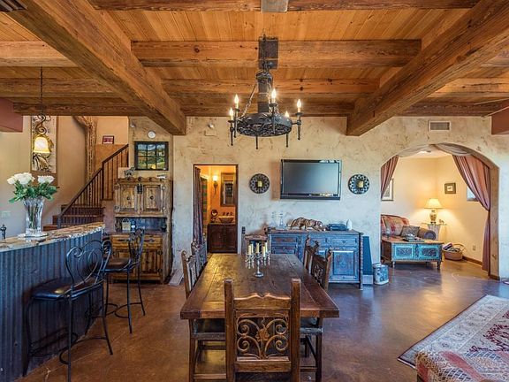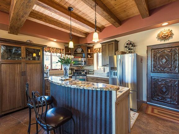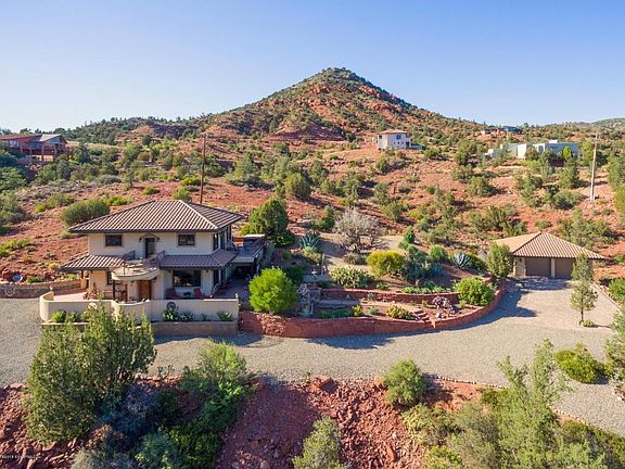 European style home exudes charm! Be delighted by the custom carved doors with colorful stained glass inlays, Marble Counter top imported from Italy, Ceiling Beams and Wood flooring that was salvaged from an old Mill in S. Carolina and the Copper Kitchen Sink. Built into the mountainside with Insulated Concrete Blocks for great Energy Efficiency. Stained concrete floors have happy, whimsical hand painted designs, custom designer tile showers and beautiful Ironwork throughout. Situated on over an acre of extensive gardens at the end of the road with Oak Creek Access just a short distance away. Wildlife and birds constantly entertain. Master Suite opens to a wonderful deck to capture the views of Cathedral Rock. Decks and Patios for wonderful gatherings of friends. You Just Must See!