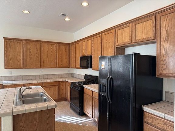 Carpet throughout with vinyl in the kitchen and bath. Den or office area including ceiling fan. Kitchen with small dining area, island seating and tile counter tops that includes fridge, gas stove, built-in microwave and dishwasher. Family room with ceiling fan, gas fireplace and entertainment alcove. Living room with large windows for natural light. Primary bedroom with ceiling fan, roomy walk-in closet and attached bath with stand-up glass enclosed shower and garden tub. Laundry room with hook-ups and space to hang clothes. Landscaped front and backyard with mowing service provided.