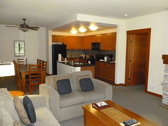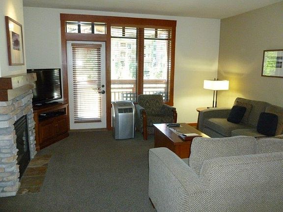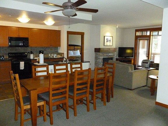 Large three bedroom, with huge deck overlooking the reflection pond and pool area. Steps from Gondola, restaurants, and shops in The Village at Mammoth. Craftsman style décor with plenty of room for friends and family. Washer and dryer in suite.