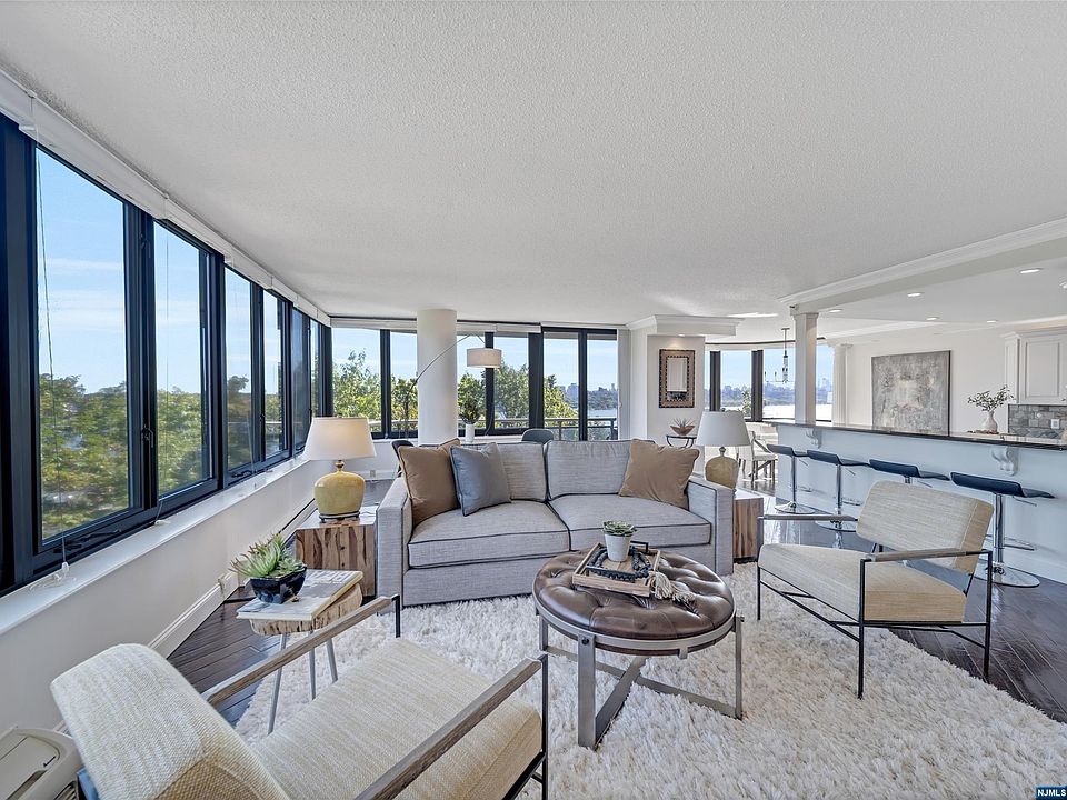 This approx 1800 sq ft turnkey corner unit offers breathtaking views of the Hudson River and the iconic NYC skyline from abundant windows and a private terrace. The gourmet chef's kitchen features Viking professional stainless steel appliances, granite countertops and a natural stone backsplash. The primary bedroom is a tranquil sanctuary with a spa-like en-suite bathroom featuring natural stone tile, a jetted tub, walk-in shower and two sinks. The unit boasts 9-foot ceilings, hardwood floors in the living room and in-unit laundry. The prestigious building provides world class amenities, including 24-hr doorman, valet, pool, gym, library, lounge and event hall. One indoor parking space is included on the same level, with an option for an additional space for a fee ($135). Convenient access to NYC via NJ transit or NY Waterways ferry.