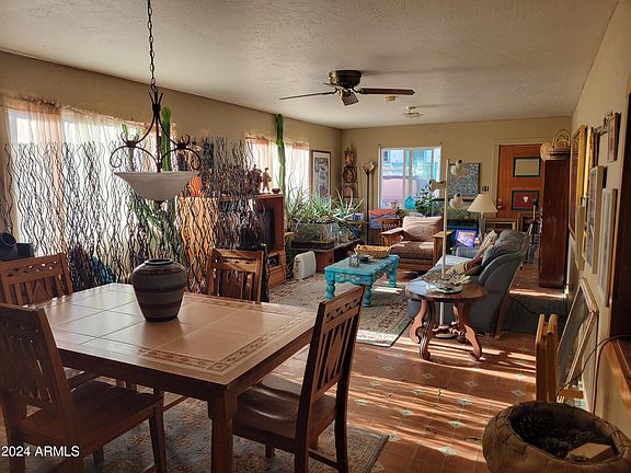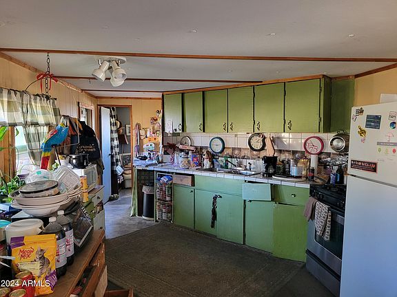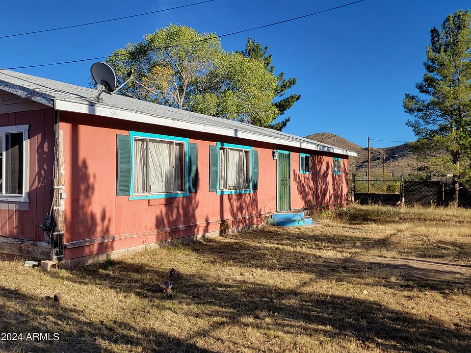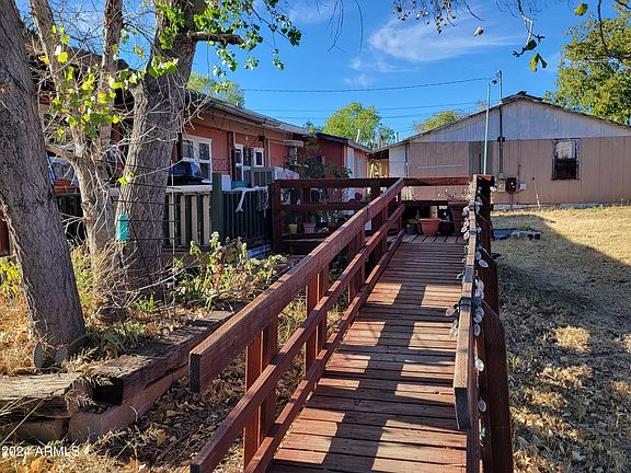 1969 Manufactured home has been incorporated with additions to living space, square footage has not been confirmed. 1 bedroom, 2 bath on over half acre fenced lot. One electric heater in kitchen area, space heaters are used in bathrooms. Evap window unit and ceiling fans to cool. Bathrooms need some work. Everything is functional, appliances convey. New tankless water heater. Detached warehouse/ studio space with power. Motivated seller.