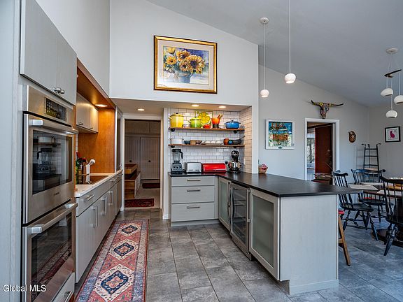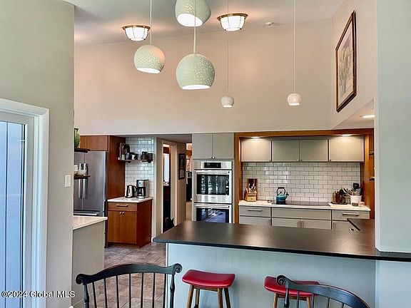 Over 4500sf of living space ! Hidden gem tucked away in the woods. This impeccable 1970's custom mid-century style waterfront home on the Poestenkill Creek in Brunswick is in superior condition . It's modern flair promises to WOW w/ its comfortable floor plan made for relaxing or entertaining. IN-LAW potential with this expansive 1st & 2nd floor living space. Updated, eat-in kitchen, high end appliances, fam room w/bar & wood stove, spacious DR & comfortable LR. Enclosed three season room that overlooks creek and woods, Trex deck off kit. 3 BR on the main floor with primary en-suite & additional Full Bath, Mudrm & laundry .Finished lower level with walk out to fenced yard, a theater game room & bar for entertaining w/ FP. 2 additional BR & bath .Tons of storage, new dual heat, 3 car gar