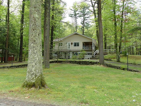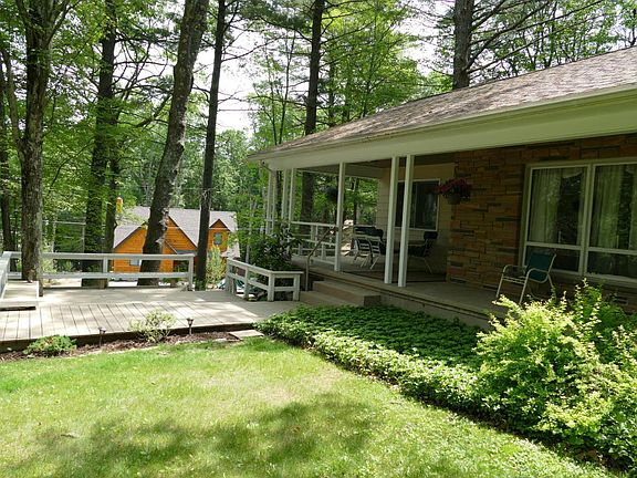 Beautiful House in Colony Cove South with BOAT SLIP! This charming home situated on a spacious corner lot comes with everything you need to enjoy the Lake Wallenpaupack area. Wallenpaupack Schools, low taxes! 3-4 Bedrooms! The large Deck area & covered Porch of this attractive raised ranch with stone front are easily accessed from the open Kitchen and Dining Room. There is a lovely cottage feel but this is a full house with stone fireplace in the Living Room, oak flooring in the main floor Bedrooms, a walk-out finished lower level with Family Room and additional Bedrooms and space. The Family Room has a coal stove and built-in cabinetry with attractive stone walls. Several ''Extra Rooms'' offer flexibility! Boat garage and storage shed included. 2 minute walk to your dock! Great location!