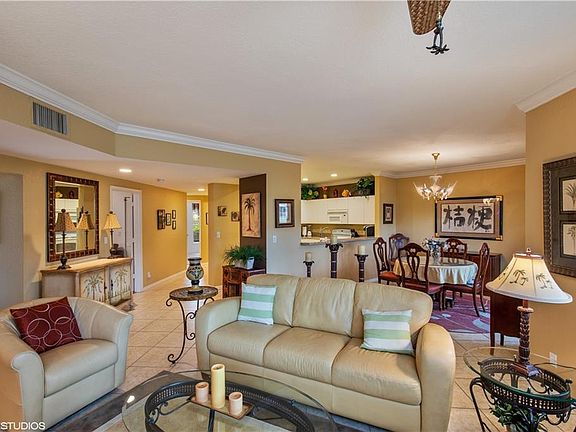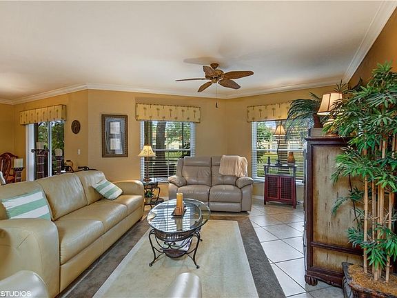 Pet-friendly, first floor unit near the clubhouse and community pool. Home features crown molding living, dining and kitchen. Hurricane impact windows in master and living room. Diagonal-placed neutral (new) tile in living room, dining room, and kitchen. Kitchen bottom cabinets feature pullout drawers. AC unit is only 4 years old and hot water tank only 3 years old!! Much desired updated higher sitting toilet in both bathrooms. Kitchen has newer countertops. All the window treatments, blinds, and beautiful chandelier stay! Great view of the fountains in the lake with birds and squirrels with no direct sunlight into the screened lanai. Enjoy the convenient location near lots of shopping, restaurants, beaches, and the interstate.