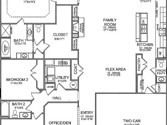 The Atkinson is a spacious ranch plan with three bedrooms. The main living areas, including a flex area, share an open layout with 10' ceilings. The kitchen has an island with counter dining, spacious pantry, and breakfast area with multiple windows. A hallway with coat closet and powder room, connects the kitchen to the garage. The family room with fireplace overlooks a large, covered patio. The primary bedroom is located off a semi-private hall and has a trey ceiling and triple window. A luxury bath with separate vanities, a separate shower and garden tub, linen closet, and an oversized walk-in closet complete the suite. Bedrooms two and three share a hall bath, and there is a spacious utility room with folding counter. Exterior details include a covered front porch, dormers, separate garage doors, and hip roof.