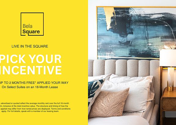 All rents advertised or quoted reflect the average monthly rent over the full 18-month lease term, inclusive of the total incentive value. The structure and timing of how the incentive is applied may differ from how rental prices are displayed, as the total incentive amount is allocated in increments in accordance with your lease. The full value of the incentive will be honoured over the lease term. Available for a limited time only. Terms and conditions apply. For full details, speak with a member of our leasing team.
