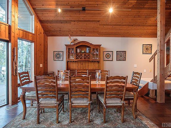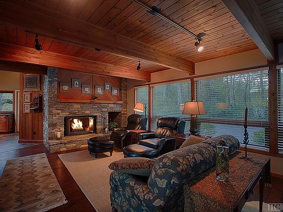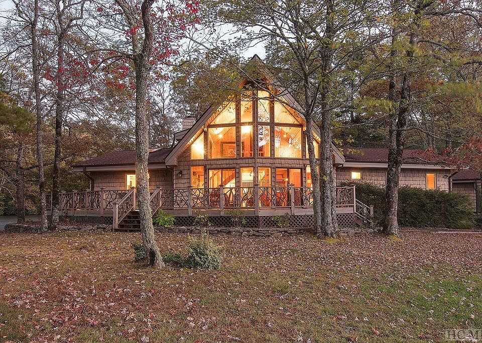 This is the lot everybody dreams of. A point jutting into the lake. Flat as a pancake. Water on three sides. Great mountain view. A house in this setting should certainly maximize the view...and this house does. Outside, a wrap-around deck and a fire pit. Inside, a window wall brings the outside view in. This cozy mountain bungalow has four bedrooms, living room and dining that enjoy the view, and a den with a wood-burning fireplace. The double boathouse has TWO electric lifts. There's a 2-car garage and a circular driveway. Lake Toxaway Estates is a premier mountain lake community in western North Carolina featuring the state's largest private lake, Lake Toxaway. Spend your days water skiing, canoeing, kayaking, fishing, sailing and pontoon boating. Residents may optionally join Lake Toxaway Country Club and enjoy fine dining, tennis, croquet and an award-winning 18 hole golf course designed by Kris Spence. A recent, major renovation of the clubhouse is winning awards.
