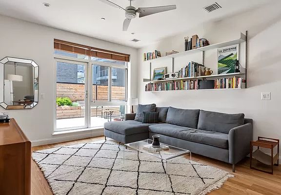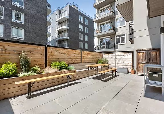 1E at 100 Engert Avenue is a true needle in the haystack amongst a sea of cookie-cutter inventory in Greenpoint and Williamsburg. Situated only moments from McCarren Park, this oversized, beautifully designed one bedroom spans 820 square feet and features a 350 square foot private patio. A notable detail of this property is that despite the first floor designation, the elevation of this unit is on the 2nd floor of the building, so light, air and exposure is significantly above street level. This mint-condition home offers stunning natural light, an abundance of outdoor space, high ceilings and a newly gut renovated bathroom. There is also an additional 300 square foot private cabana included in the price. Enter the home into a large foyer with space for an entry bench, large scale art and two sizable closets. The open concept entertaining area features a well appointed kitchen with a large island, carrera marble countertops, oversized farmhouse sink and a retro-style Big Chill refrigerator. There is also an adjacent dining area and additional space for a home office. Connected to the west-facing living room is a 26' x 13'8" patio clad in cedar fencing with built-in benches, planters, and 350 square feet of prime outdoor living space. Enjoy west, south and northern light from your own private patio perched above the building's first floor. The bedroom is oversized and can easily accommodate a king size bed and also features a walk-in closet, and newly renovated bathroom with a deep soaking tub clad in Heath Ceramics tile, custom white oak vanity, and tons of customized storage. 1E also features an in-unit washer/dryer and an additional 300 square foot deeded rooftop space with views of downtown Manhattan. Conveniently located near both the G & L trains, 100 Engert Avenue is a park-adjacent elevator condominium with a tax abatement, common roof deck, video intercom system and fitness center.