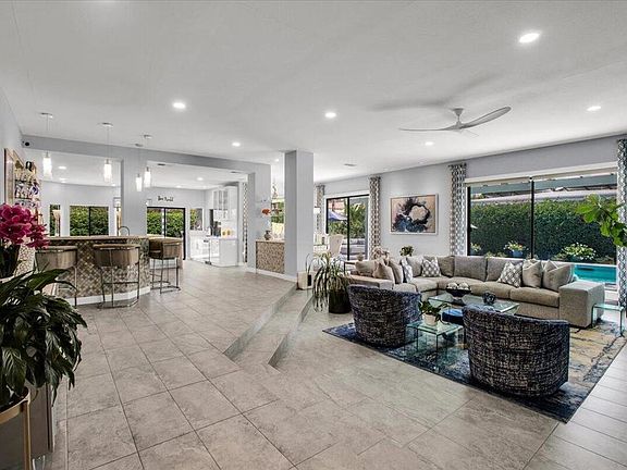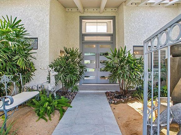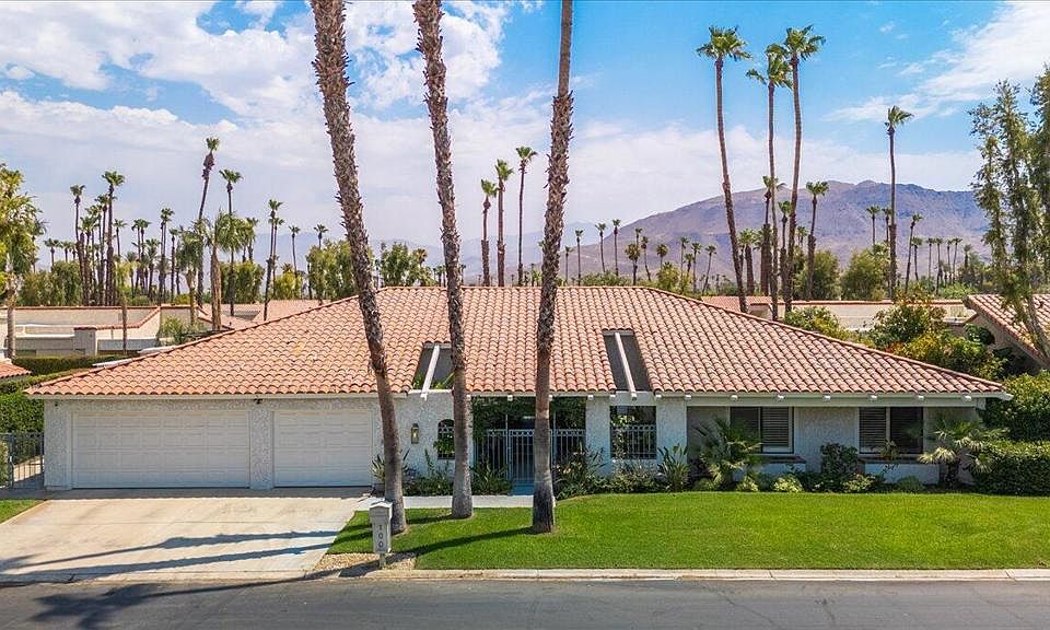 Located behind the gates of Rancho Mirage's exclusive Country Club Estates, this expansive single-level home is a complete remodel that showcases nearly $300,000 in new upgrades. Mid-Century Modern influences seamlessly blend 3,169 sq. ft. and host three bedrooms, three baths, and an office that can become a fourth bedroom. 10' ft ceilings and large windows welcome abundant natural light that heighten the sense of openness in a great room for entertaining with a dramatic tiled wall that surrounds a fireplace and built-in 85 inch TV. The exquisite residence is adorned with porcelain tile flooring that continues to outdoor patios, contemporary lighting fixtures, plus a large walk-in wet bar that is destined to be the centerpiece of social gatherings. A chef's dream, the kitchen is all new and features an oversized island, gorgeous quartz countertops, new custom cabinetry, generous storage, and a suite of stainless steel appliances. The expansive primary suite pampers homeowners with a retreat that opens to a patio, a spacious walk-in closet, and an opulent new spa bath with twin sinks, a soaking tub, a huge glass-enclosed steam shower and a private atrium. Two new air-conditioners, 42 new solar panels and a new hot water system work effortlessly behind the scenes, including a separate laundry room, and 3 car garage. Very private rear grounds allows natural sunbathing in a brand-new pool with tanning shelf. Low HOA's of only $455 a month!