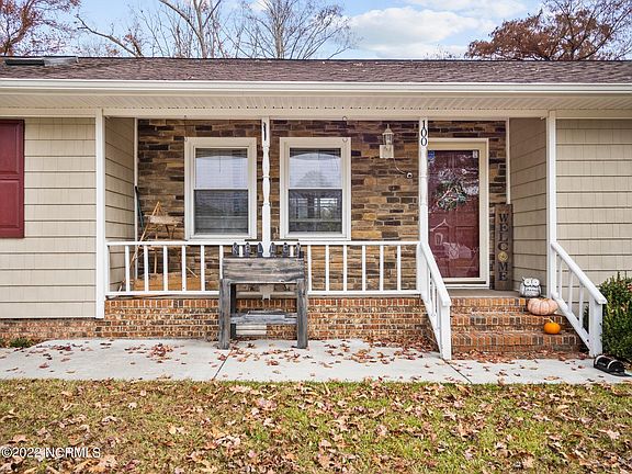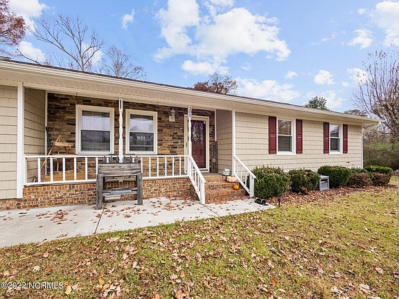 Welcome home to 100 Estate Drive where you'll be happily greeted by a few little wild bunnies who like to frequent the front yard! This home is truly a RARE FIND and just like the friendly woodland animals, it's sure to be a favorite of yours too! Located in a quiet cul-de-sac less than 15 minutes to MCB Camp Lejeune and MCAS New River — not only is this location a quick commute to work, it's close to everything else you could want or need. With so much character and charm, this gem is sure to make you feel right at home. As you enter inside the covered front porch, you'll find the most charming den space boasting a ceiling fan, laminate flooring, and crown molding. Off the den, take a peek into the dining area which features its very own built-in coffee bar! The cozy kitchen features a peninsula for extra seating and subway tile backsplash. It doesn't stop there — the highlight of the home is the family room where you'll find a beautiful textured accent wall, vaulted ceiling, skylights, and a wood-burning fireplace! To add, the primary bedroom is just off the family room, complete with an en-suite and walk-in closet. The home also includes 3 extra bedrooms, 2 more baths, and a newer roof. Finally, sitting on over half an acre, the backyard is an absolute showstopper and perfect for entertaining! Beautifully landscaped — it features a large deck, workshop, shed, AND a play area — complete with an awning for a darling entrance into the space. To add, the seller has made a pathway to the small creek through the back gate! Don't wait, make this jewel yours today!
