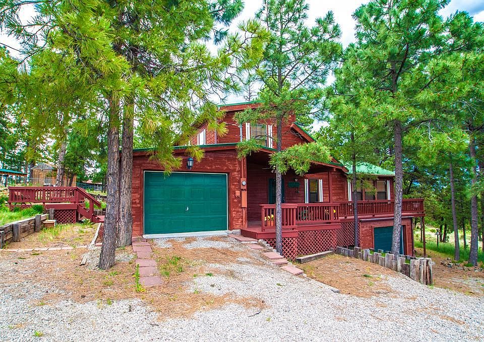 A DISTINCTIVE FIND ON CORNER LOT! Prepare to be impressed with this well-maintained 3 BR/2 BA two-story. Engaging, metal-roofed home enhanced by open kitchen with breakfast bar, dining and living room floor-plan-dry bar and with fireplace, vaulted wood accented ceilings, plus a family room with fireplace. Main-level laundry. Large main level master BR suite with fireplace also. Two single car garages, decks. Metal roof with snow guards. Mostly furnished too. Here's a stand-out offering neat extras.