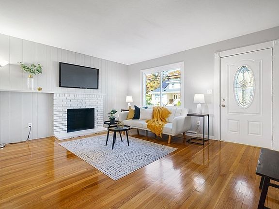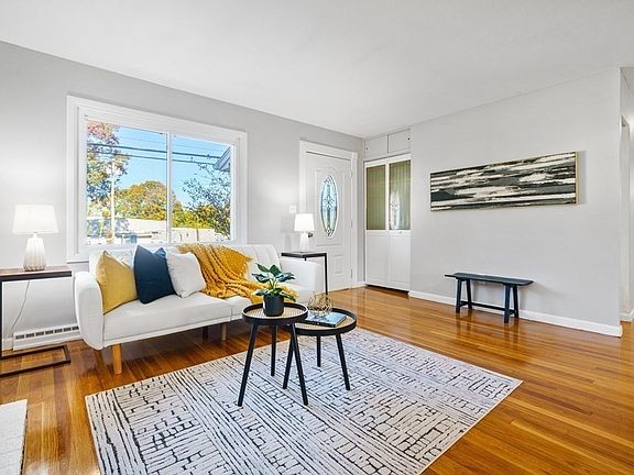 WOW!! Quiet side street updated ranch with over 1500 sq feet of living space and a great yard. Walk in the front door and you are greeted by an open concept living, dining and kitchen area boasting beautiful hardwood floors, loads of natural light and fresh paint throughout. Then to the eat-in kitchen which features, bright white cabinets, stainless appliances with new stove. There are three ample sized bedrooms, with large windows. fresh paint, beautiful hardwood floors, and plenty of closet space, served by a full bath. Off the kitchen is a fantastic covered deck, which overlooks a very large flat back yard, perfect for kids or entertaining. The basement offers about 600 sq feet of additional finished & heated living space, w/ a half bath. This is a perfect area for play, home office or additional entertaining space. There are laundry hookups and direct access to your garage. This house has forced air gas heating system and is move in ready and, includes a 1 year home warranty.