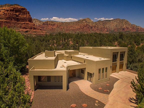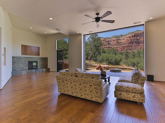 Open the door to magnificent natural beauty outside, blended with exquisite luxury appointments inside, all set in a secluded, serene, and idyllic location. This is a home designed for tranquility and contentment. In the Great Room, step through the wall of automated, disappearing glass doors onto a back patio enveloped by the Red Rock formations and trees of the National Forest. The open concept great room leads to the spacious and elegant gourmet kitchen; the perfect setting for large gatherings.