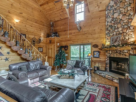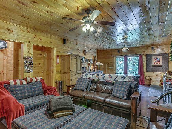 Very private, custom 3/3 cabin style home (2861 sq. ft.) with hard to find storage/closet space on all levels. This home sits on 2.47 acres with a small branch bordering two sides and a pond view. Long concrete driveway leads to a 4 car carport. Also has 384 s.f. wrkshop.Home features a large great room with 26 ft. cathedral ceiling and soaring river rock fplace.Upgraded kitchen with cambria quartz counter tops, stainless steel appliances , spacious pantry with rollout drawers.Main floor master features walk in closet. Half- log stairs/laurel banister leads to second master suite, plus loft. Full finished terrace level w/game/home theatre room featuring surround sound and wet bar, third bedroom with full bath and a unique"secret room. Great community