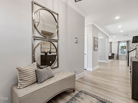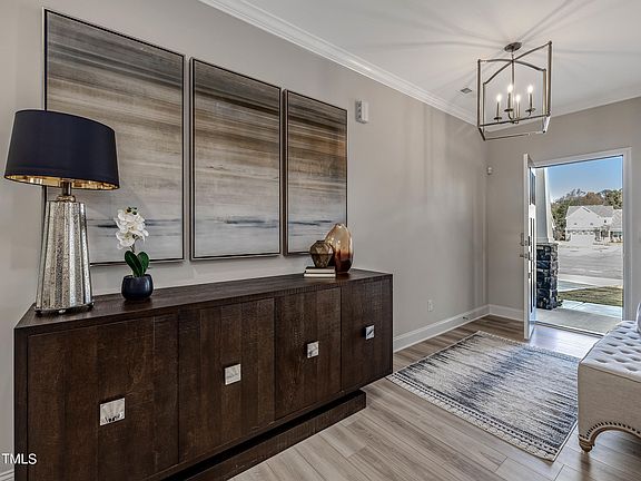 This Jordan is an elevation 1 with gray siding, beige trim, and a black front door. Downstairs includes a covered full front porch, downstairs guest suite with full bathroom/walk-in tiled shower, a formal dining area, family room, breakfast area, spacious kitchen with island, oak stair treads, open railings, all hard flooring, and 2 car garage. The kitchen includes pendant light prewiring above the island, upgraded white cabinets, satin nickel pulls, upgraded sink/faucet, quartz counters, herringbone backsplash, and gas appliances. Upstairs includes an open railing with a loft area in addition to 3 spare bedrooms and the owner's suite. All 5 bedrooms and family room have fan pre-wires. Upstairs, one full bathroom has a tub/shower combo and double vanity with quartz counters, one has a walk-in shower and single vanity with quartz counters, and the Owner's bathroom has a walk-in tiled shower with tiled seat and niche, double vanity with quartz counters, spacious closet, linen closet, and private water closet. All wet areas upstairs including laundry room have hard flooring and all other areas have upgraded carpet. Within walking distance to Olde Liberty's 700 Acre Golf Course and in close proximity to the conveniences of Wake Forest. *PHOTOS FOR MARKETING PURPOSES - HOME IS UNDER CONSTRUCTION*