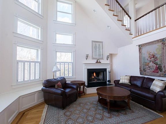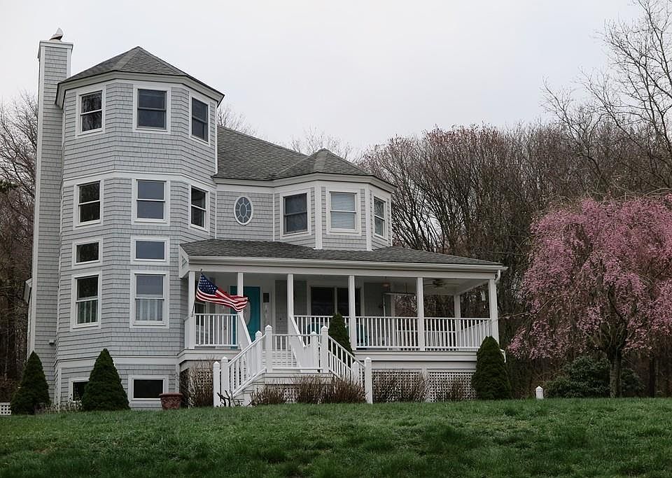With 2.5 private acres, this custom-architect designed home is tailored w/ high-end finishes & style, cathedral-ceilinged living room, hardwood floors, fireplace, central a/c, central vac, alarm owned. 3 beds, 4 full baths, and tower room getaway on the 4th level w/ seasonal views of the Jamestown Bridge to Quonset Point. Gourmet cooks' dream kitchen w/ commercial gas stove and granite island for prep work and entertaining. Spacious kitchen leading to new deck, perfect for grilling and watching birds, wildlife, and deer. Enjoy relaxing on the front porch or on the fenced in stone patio area, accessible from a 100% finished, walkout lower level. Potential in-law, attached 2-car garage, and updated stone circular driveway. Private woodland backyard with walking path, wildflowers, and perfect spots for a hammock.Listen to the sounds of the bay, such as the distant fog horns of Newport Harbor, or on quiet nights hear small waves breaking on nearby Head's Beach, a 1/4 of a mile's walk away.