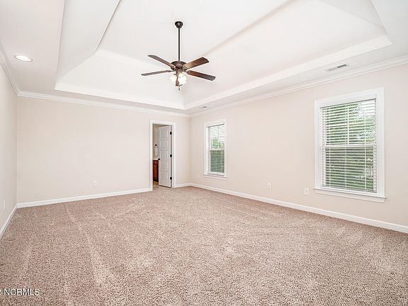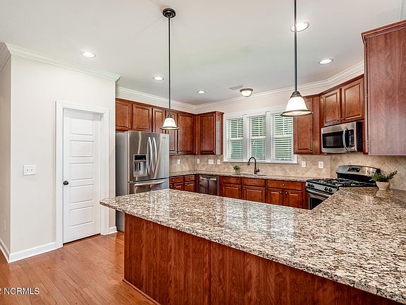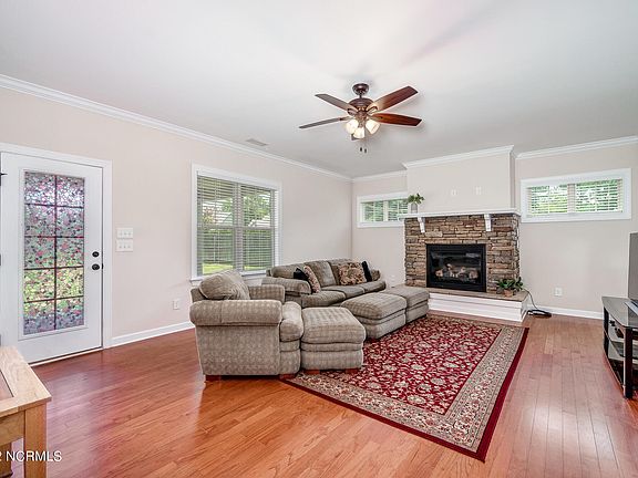 This home in the coveted community of Marsh Harbour stuns from the moment you arrive. It is a classic — with a manicured front yard, marine-blue shutters, and a welcoming front porch perfect for greeting guests. The grand entrance is highlighted by the natural light that pours in and leads to the living room with a stone fireplace. Warm wood floors in the main areas and architectural details like arched doorways, cathedral ceilings, and a coffered ceiling in the formal dining room lend a traditional yet upscale feel to this home. Head upstairs and admire the view below from the second floor mezzanine before checking out the additional bedrooms, breathing room, and loads of space. Beauty is combined with utility in this home with a thoughtful floor plan that allows for flow and function and privacy, too. The gourmet kitchen is gorgeous and spacious and where you will want to spend time together cooking elaborate meals or just hanging out. Another advantage of living here is the proximity of the Boathouse Creek Walking Trails Park on the White Oak River. Anyone who enjoys connecting with nature will recognize the benefit of this trail system that combines scenic vistas of woods and island shoreline. Step out the back door and admire the expansive yard. It is as thoughtful and appealing as you'd imagine, with more green space and a covered deck. Invite your friends for a cookout and sip margaritas and icy cold beers. At this address on Hope Town Court, you can have it all without ever leaving home.