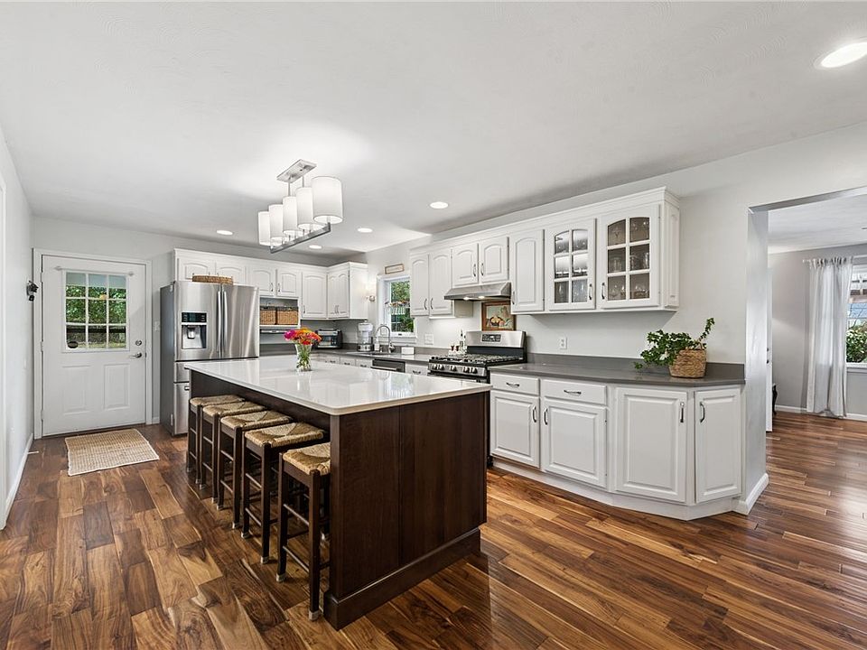 Penn-Trafford School District! This modern farmhouse offers privacy, space, and peaceful surroundings with scenic views from every window. Hardwood floors span the kitchen, living, and dining areas. The kitchen opens to a family room with a brick fireplace, while the living and dining rooms provide ample space to entertain. A first-floor den and laundry add convenience, and a cedar-lined sunporch offers a bright retreat any season. Upstairs, four bedrooms include a private primary suite with a walk-in closet, dual sinks, and a balcony overlooking the grounds. Custom moldings and French doors add refined character. The waterproofed basement has a full bath and generous storage beneath the addition. Outside, a wraparound porch invites you to unwind, and the fenced 20×40 in-ground pool includes a broad concrete deck with a covered section—ideal for shaded summer gatherings and entertaining. Enjoy modern comfort and timeless design in a setting that feels private yet conveniently located.