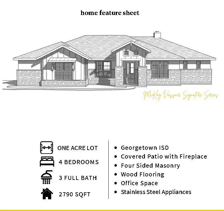 Another beautiful home from McKay Vassaur Custom Homes Signature Series. The thoughtful layout, with four beds, three baths, and a dedicated office provides plenty of space for family living and entertainment. The open concept kitchen includes designer cabinets, granite countertops, and stainless steel appliances. Entering the primary suite you will recognize the builder's attention to functionality along with high-end design with his and hers walk-in closets, and a large primary bathroom including dual vanities and a unique "wet area" that includes a soaking tub and walk-in shower. Situated nicely on a full acre, the rear of the home includes an oversized covered patio, complete with a tongue and groove ceiling and fireplace. The three-car garage offers plenty of room for the large family and the circular drive at the front of the home is another reminder of the builder's focus on functionality. The exterior includes four sides of masonry along with stucco. Feeding to Georgetown ISD, located in the small enclave of San Augustin, with an incredibly low tax rate, the home is located perfectly as growth continues outward from the Austin area. Expected completion late April/Early May, call the listing agent for a tour!