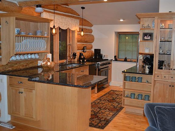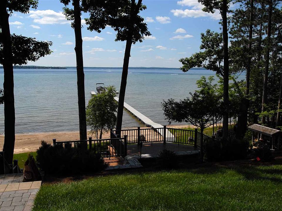 Higgins Lake historical Swedish large log home built w/logs from the land in the 1930's. 3 Bdrm, 2 bath home w/large living space that has a granite wood burning fireplace - maple wood floors throughout this home, solid Blue Pearl granite counters, Viking 6 burner gas stove, Sub-Zero stainless steel fridge, beamed vaulted ceilings, family room w/gas logs, cedar lined closets, lake views from all living spaces. That is just the house; custom through-out. There is a 60x34 heated garage w/full bath, large custom ceramic shower and a 24x30 heated workshop within the garage. Terraced, professionally landscaped yard, raised paver patio and multi-level no maintenance decks. Enter through winding wooded drive on just over 4 acres. A one of a kind property with privacy on all sides. Quiet east shore location (sunsets) with extensive sandy walk-out to deeper water; Caribbean blue! Pre-qualified buyers only.