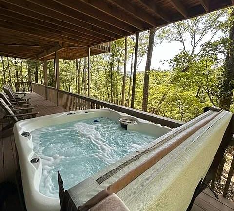 Year round mountain viewsExpansive mountain viewCovered deckOpen air deckLoft areaHot tubWide yellow pine hardwoods
